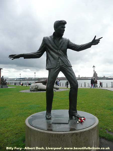 The birth, in Liverpool, of Billy Fury. He equalled The Beatles' record of 24 hits in the 1960s, and spent 332 weeks in the UK charts, without ever reaching Number One. In 2003 this bronze statue of Fury (see