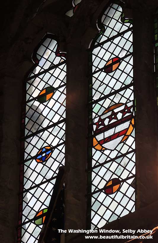 picture) at Selby Abbey in Yorkshire incorporates the Washington family coat of arms, three red stars above two red bands on a white shield, the model for the American Flag. It most probably represents some kind of benefaction made to the Abbey to commemorate John Wessington. He was Prior of Durham from 1416~1446 and the most distinguished collateral ancestor of George Washington.