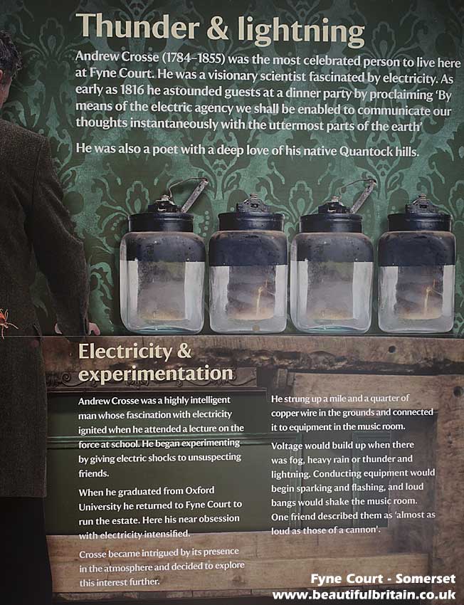 1855 The death of Andrew Crosse, an early pioneer and experimenter in the use of electricity. Crosse was born and died at Fyne Court, Broomfield, Somerset. The house burnt down in 1894 but this information room (see picture) at Fyne Court tells the story of the man known locally as 'The Thunder and Lightning Man'. This obelisk (see