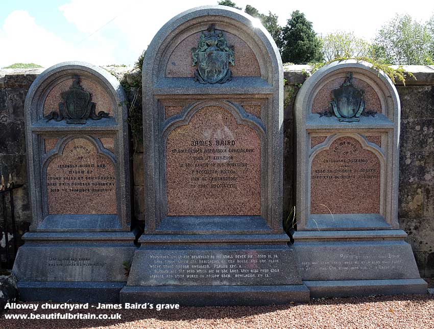 1876 The death of James Baird, Scottish foundryman, industrialist, philanthropist and MP for Falkirk Burghs. He founded William Baird & Co. which went on to become the largest producers of iron in Britain, employing 10,000 people. He is buried at Alloway churchyard- see picture. The village was also the birthplace of the Scottish poet Robert Burns.