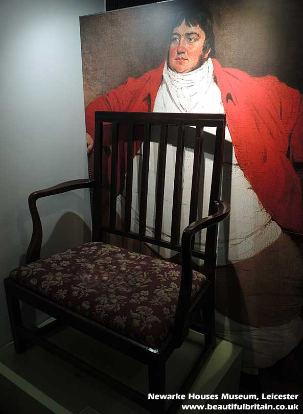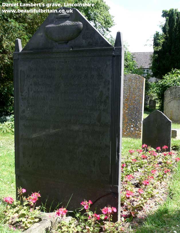 picture of the Daniel Lambert chair and his portrait in Newarke Houses Museum, Leicester. By the time he was aged 35 he weighed 50 stone (700 lb / 320 kg) and was the heaviest authenticated person at the time. He died suddenly (aged 39, at Stamford, Lincolnshire) and was buried in St Martin's Church graveyard. See