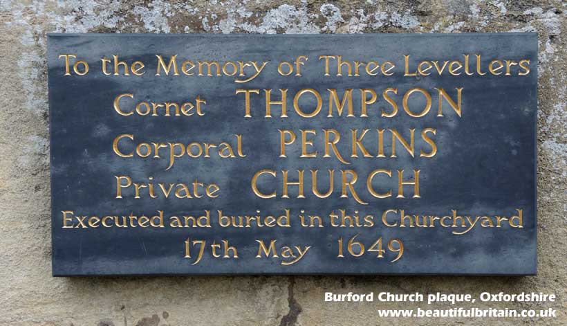 1649 Cromwell's troops captured 300 Levellers and locked them up in Burford church. (The Levellers believed in civil rights, a 'level' society and religious tolerance and Cromwell was determined to crush them.) Three of the Levellers were executed on Oliver Cromwell’s orders in Burford churchyard, Oxfordshire. See the plaque ( picture) at Burford Church.