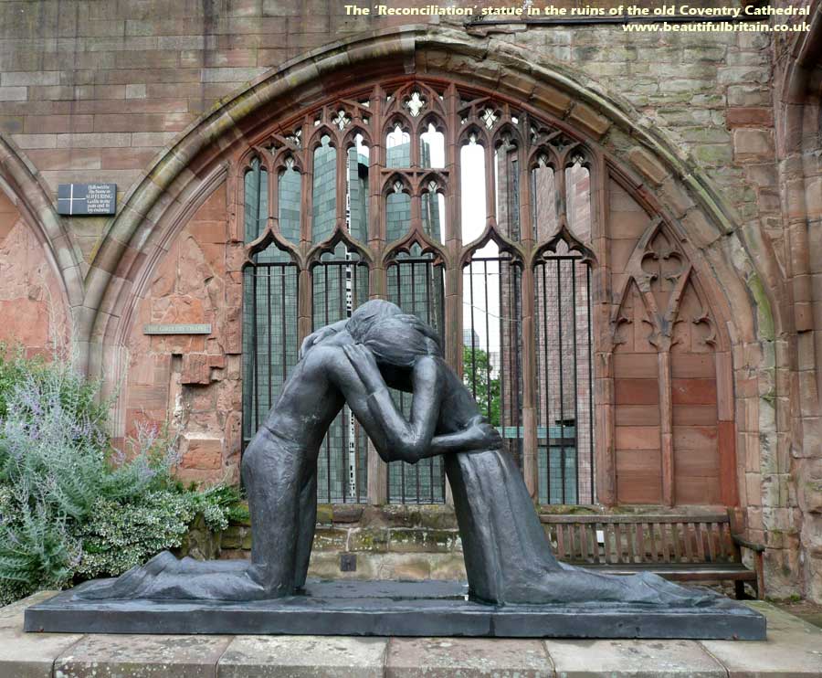 picture of the reconciliation statue in the ruins of the old Cathedral.