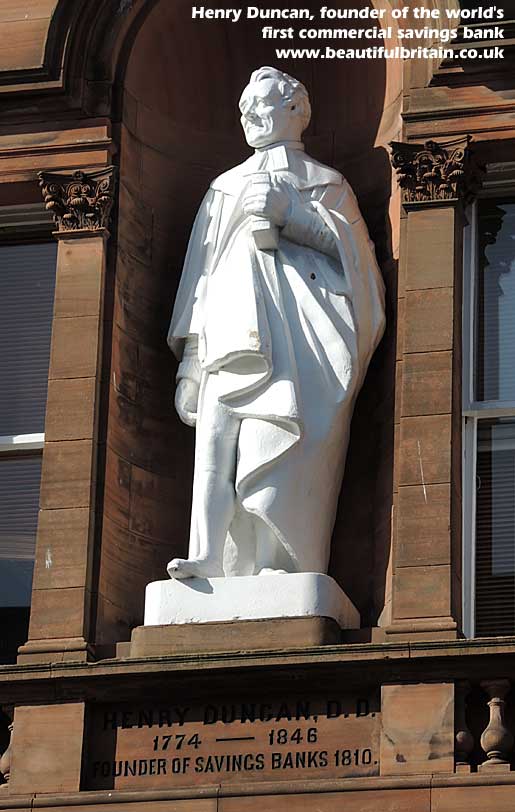 1744 The birth of Henry Duncan, a minister of the Church of Scotland who founded the world's first commercial savings bank, paying interest on its investors' modest savings. This statue of him (see picture) is at Dumfries