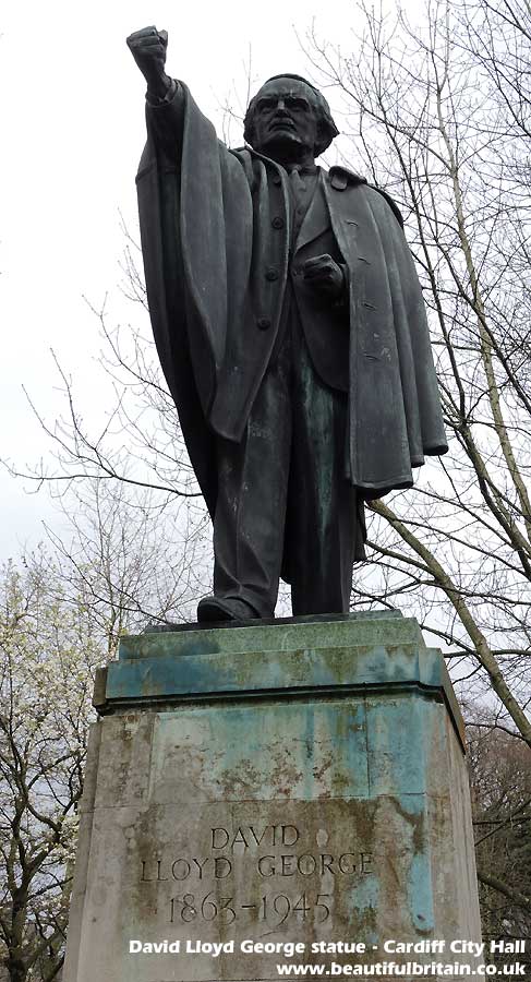 picture of the David Lloyd statue near Cardiff City Hall.