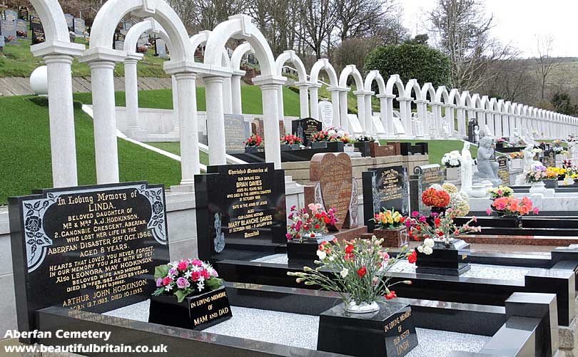 farm and a row of terraced houses. The tragedy occurred at the beginning of the school day and on the day before the school closed for the half-term holiday. The children are buried in Aberfan's cemetery, on the hillside above the valley. See picture. See also my