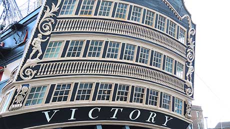 HMS Victory is a 104-gun first-rate ship of the line of the Royal Navy. She is 227 ft. 6 in. (69.34 m) long overall, has a beam of 51 ft. 10 in. (15.80 m) and a crew, at the time of Trafalgar, of 821 men. Victory was ordered in 1758 and launched from the Old Single Dock in Chatham's Royal Dockyard on 7th May 1765. She led fleets in the American War of Independence, the French Revolutionary War and the Napoleonic War. In 1805 HMS Victory achieved lasting fame as the flagship of Vice-Admiral Nelson in Britain's greatest naval victory, the defeat of the French and Spanish at the Battle of Trafalgar. In 1922, she was moved to a dry dock at Portsmouth and is preserved as a living museum to the Georgian Navy. HMS Victory has been the flagship of the First Sea Lord since October 2012 and is the world's oldest naval ship still in commission, with 244 years' service as of 2022.