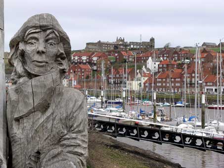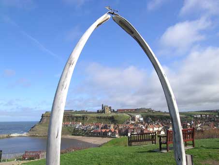 Whitby's history includes connections with whaling and the explorer Captain James Cook. It was probably in the nearby fishing village of Staithes that Captain Cook decided to go to sea, before he subsequently became an apprentice to a Whitby ship owner in 1746. The town's historical past is revealed in monuments that dominate Whitby's east and west headlands and the harbour. For 80 years (1753-1833) Whitby's fishermen were engaged in whaling. The whale jaw bone arch on the West Cliff - picture 1 above, was presented to Whitby by Norway in 1963. The monument to Captain Cook (picture 2) includes a carving of the Resolution, one of Cook's four ships. Other links with Whitby's seafaring past are remembered in its pub signs and wooden carvings by the quayside - picture 4.