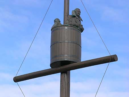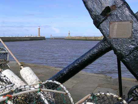 All Captain Cook's four ships - Endeavour, Resolution, Adventure and Discovery were built at Whitby. Whitby harbour is now home to commercial fishing boats and private yachts. An authentic replica of HM Endeavour (but only 40% of the ship's original size) is berthed in Whitby Harbour. At the time of our visit the ship Grand Turk, used in the ITV "Hornblower" series was on the Endeavour's moorings. Grand Turk is the yellow and black vessel in picture 3. Click the image for an enlarged view. The sculpture in picture 4 above is of Captain Scoresby and his son keeping watch from the crows' nest. The Scoresbys were whaling captains during the Napoleonic era but were also scientists, inventors and explorers of Arctic regions. Scoresby junior did much pioneering work with magnetic compasses.