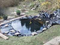 Weigh down the edges with stones and fill slowly with the garden hose. The liner will stretch to most of the contours. As the water level rises move the stones to allow the liner to sink into the pond. Complex or sharp curves will need the liner folding or shaping with the hands. |