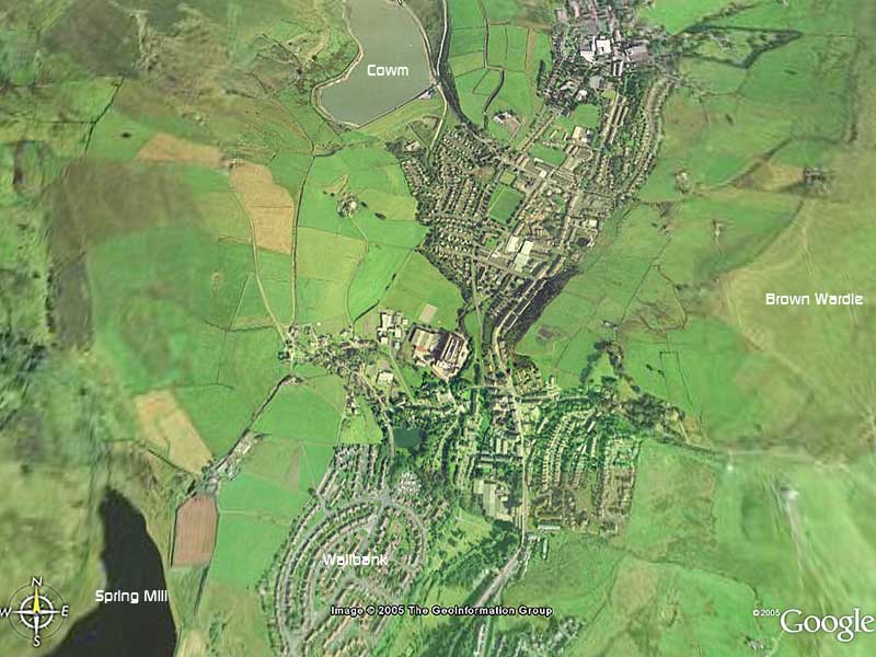 The three aerial views of Whitworth are screen grabs from the free software - Google Earth. Picture one above can be downloaded as desktop wallpaper in either 800x600 or 1024x768 size. The images are © 2005 Digital Globe and Google. Not all parts of the world are shown in such detail, but if your computer and Internet connection are fast enough, you will be amazed at Google Earth. Be warned though ... flying all over the world (and not just to Beautiful Britain) is addictive!
