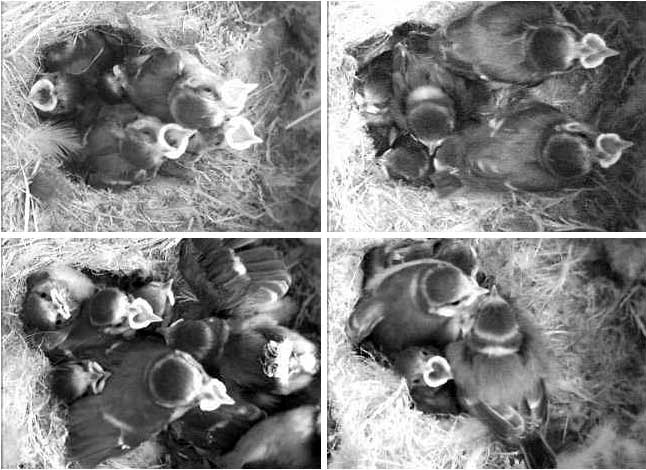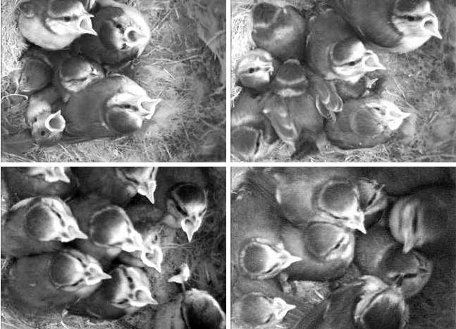 Between 29th May and 1st June growth of these blue tit chicks has been rapid and the head markings are now obvious. |